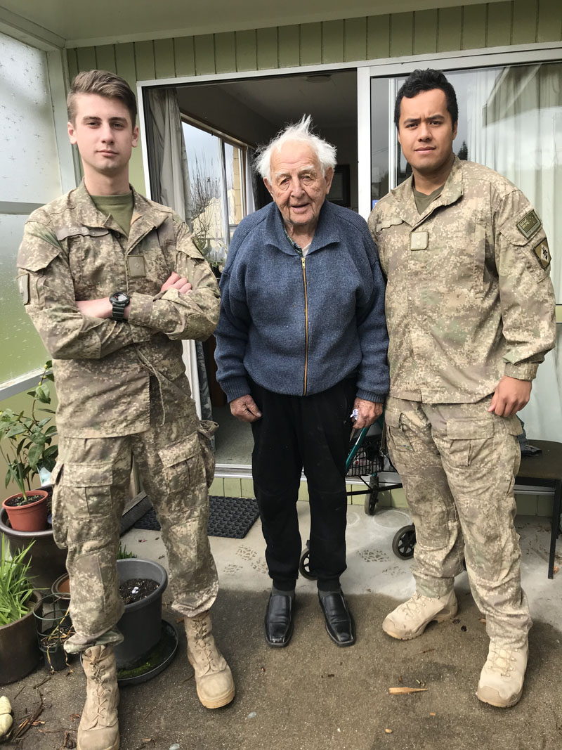 On their way back from exercise in Tekapo the BC and some of 163 Bty called in to see Donald Scott at his home in South Canterbury, found him in great form, and report that he is "a very clever man". Photo below of Don with two of the Bty's subalterns.