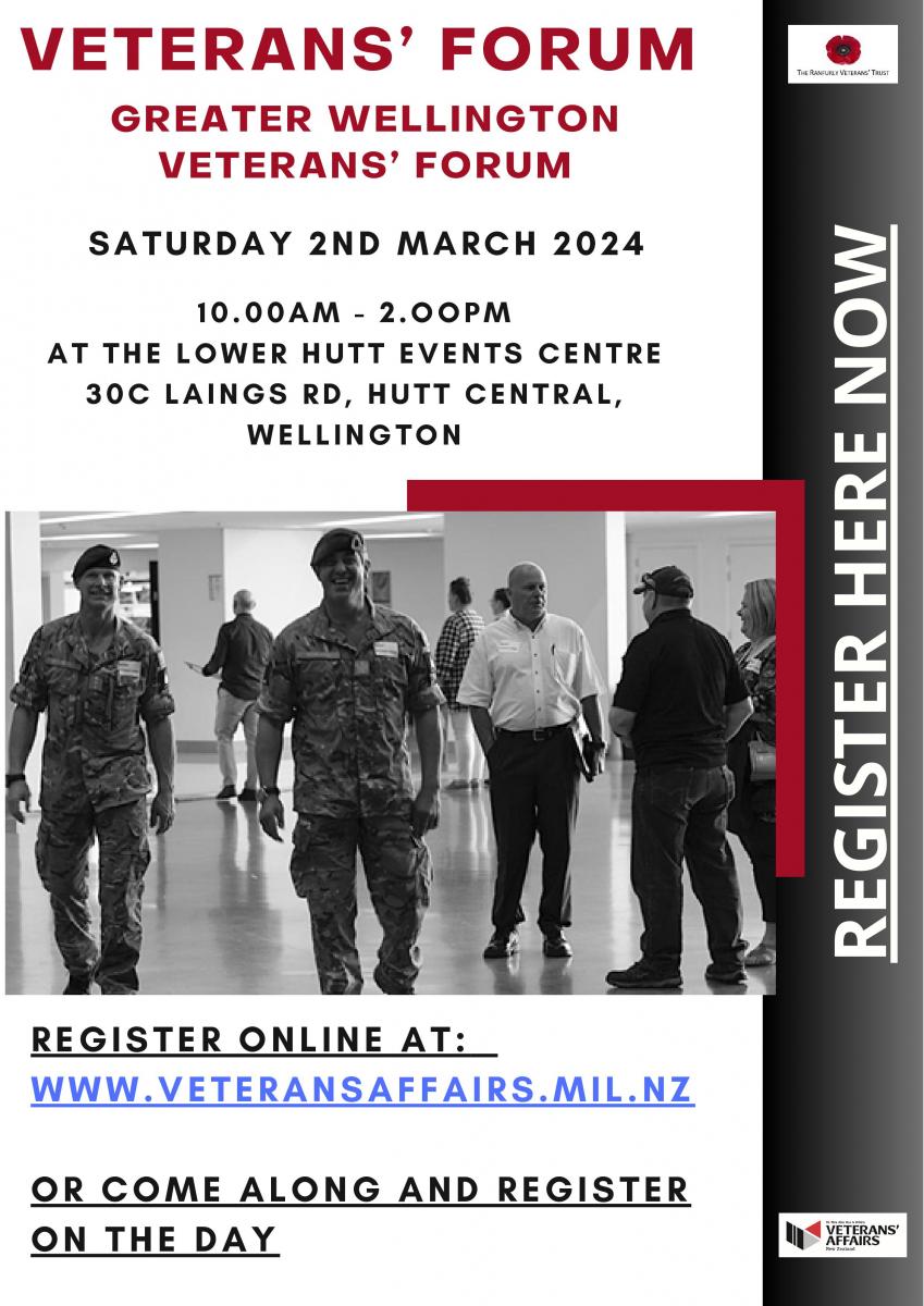 Veterans' Forum. Greater Wellington. Sat 2nd March 1000-1400 Lower Hutt Events Centre.