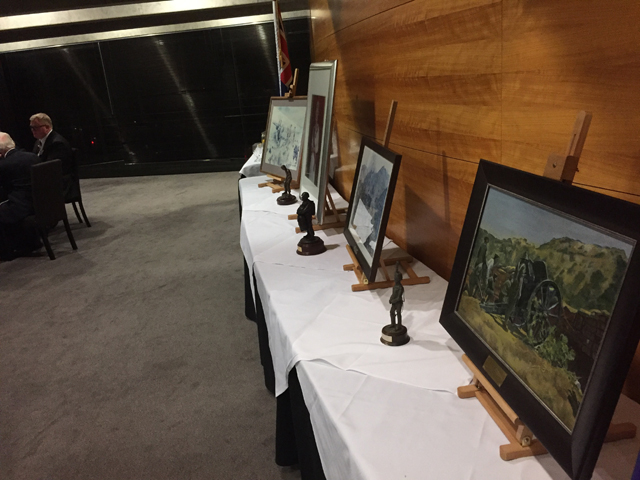 In the evening, 23 sat down to a dinner in Bellamy's Restaurant in "The Beehive" in Parliament. A very pleasant meal was enjoyed by all in some special surroundings - nice to see how MPs are looked after!! Pre-dinner drinks were held in the Parliamentary Art Space in conjunction with the final viewing of the "Soldiers Five: a Veteran's Journey" of works by Trevor Mills, Tim Wilson and (Gnr) Matt Gauldie - very interesting and inspiring!