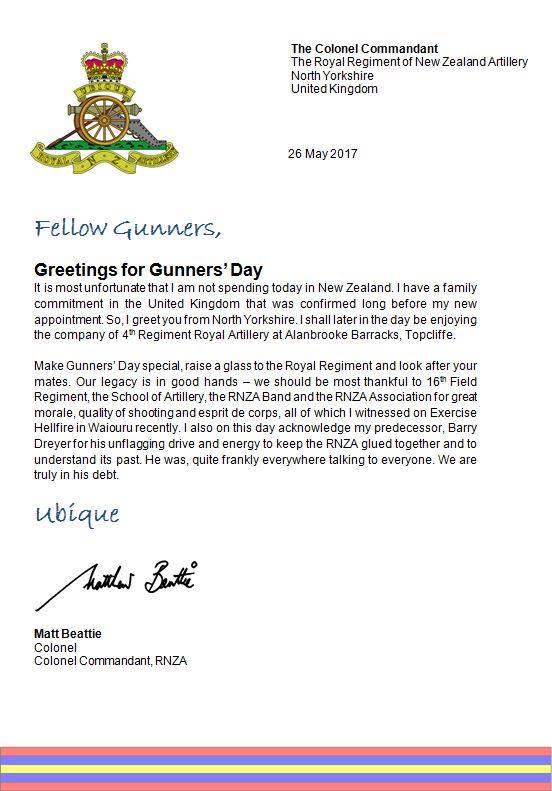 Gunners Day greetings for the 26th May from the Colonel Commandant, RNZA. He has suggested that organisers of Gunners Day events might like to read his message out.